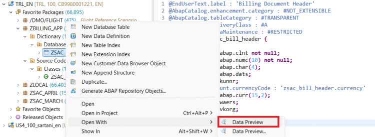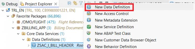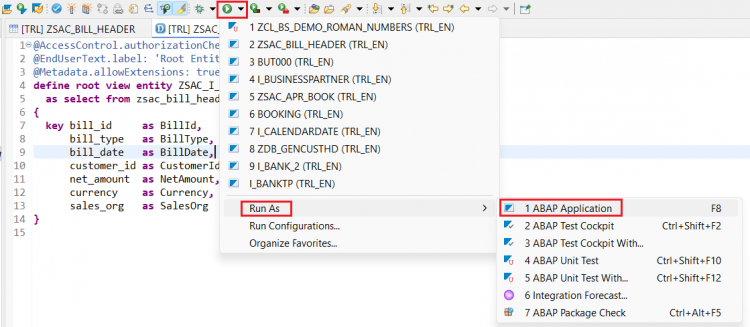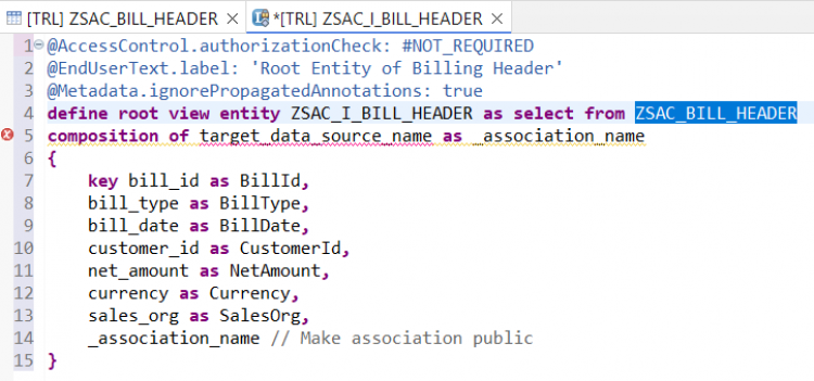 @AccessControl.authorizationCheck: #NOT_REQUIRED @EndUserText.label: 'Root Entity of Billing Header' define root view entity ZSAC_I_BILL_HEADER as select from zsac_bill_header { key bill_id as BillId, bill_type as BillType, bill_date as BillDate, customer_id as CustomerId, @Semantics.amount.currencyCode : 'Currency' net_amount as NetAmount, currency as Currency, sales_org as SalesOrg, @Semantics.user.createdBy: true CreatedBy as CreatedBy, @Semantics.systemDateTime.createdAt: true CreateDat as CreateDat, @Semantics.user.lastChangedBy: true LastChangedBy as LastChangedBy, @Semantics.systemDateTime.lastChangedAt: true LastChangeDat as LastChangeDat, @Semantics.systemDateTime.localInstanceLastChangedAt: true LocalLastChangeDat as LocalLastChangeDat }Activate the CDS Entity.
