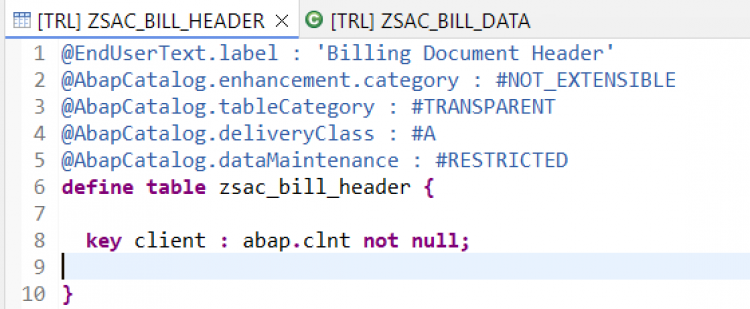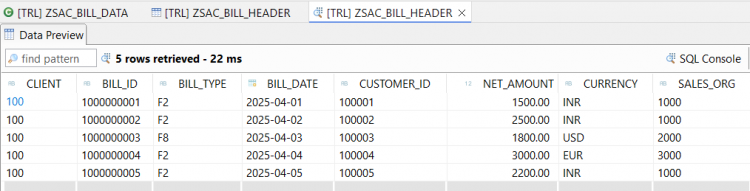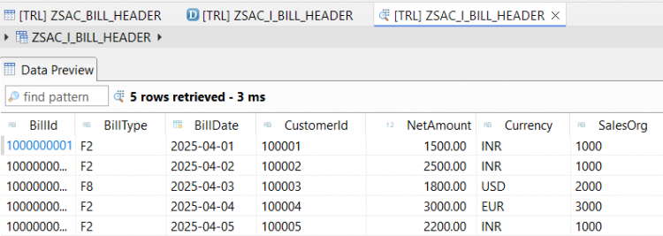 mainmethod to insert sample records:DATA lt_bill_header TYPE STANDARD TABLE OF zsac_bill_header. DELETE FROM zsac_bill_header. lt_bill_header = VALUE #( ( client = sy-mandt bill_id = '1000000001' bill_type = 'F2' bill_date = '20250401' customer_id = '100001' net_amount = '1500.00' currency = 'INR' sales_org = '1000' ) ( client = sy-mandt bill_id = '1000000002' bill_type = 'F2' bill_date = '20250402' customer_id = '100002' net_amount = '2500.00' currency = 'INR' sales_org = '1000' ) ( client = sy-mandt bill_id = '1000000003' bill_type = 'F8' bill_date = '20250403' customer_id = '100003' net_amount = '1800.00' currency = 'USD' sales_org = '2000' ) ( client = sy-mandt bill_id = '1000000004' bill_type = 'F2' bill_date = '20250404' customer_id = '100004' net_amount = '3000.00' currency = 'EUR' sales_org = '3000' ) ( client = sy-mandt bill_id = '1000000005' bill_type = 'F2' bill_date = '20250405' customer_id = '100005' net_amount = '2200.00' currency = 'INR' sales_org = '1000' ) ). INSERT zsac_bill_header FROM TABLE @lt_bill_header. out->write( 'Billing data is inserted' ).Below is the code for whole class for reference -