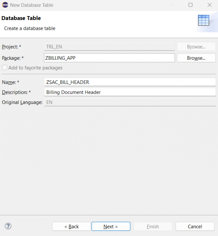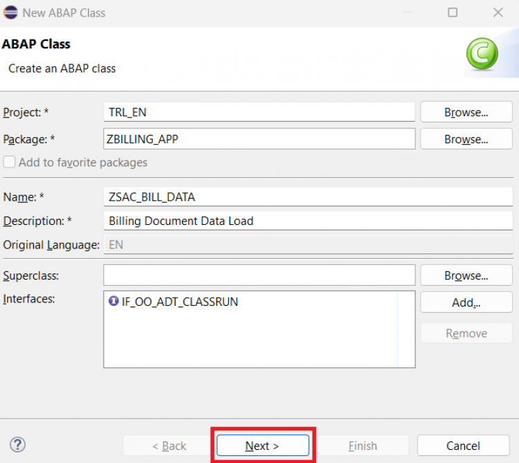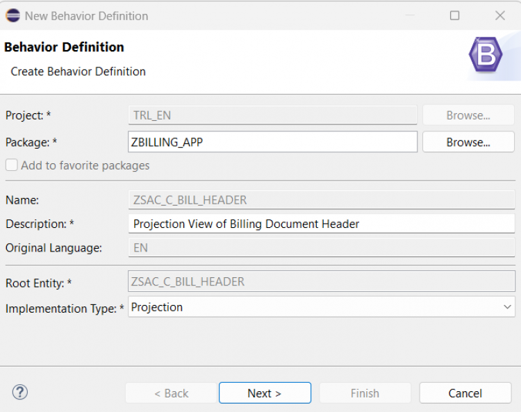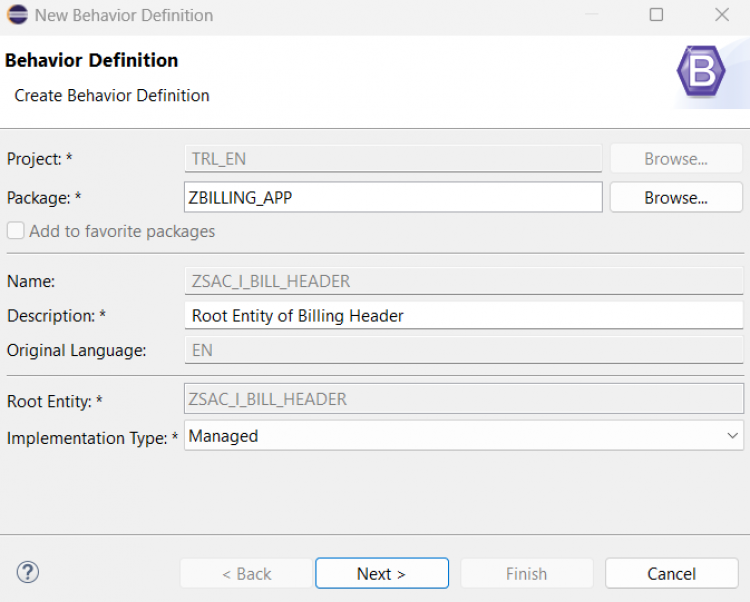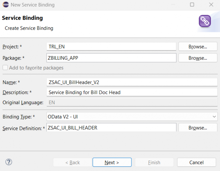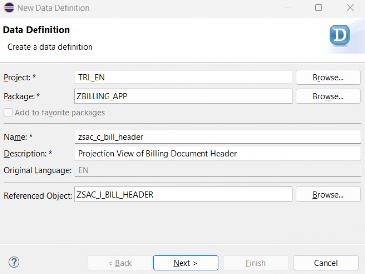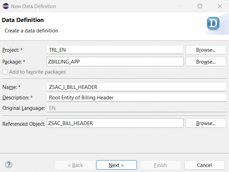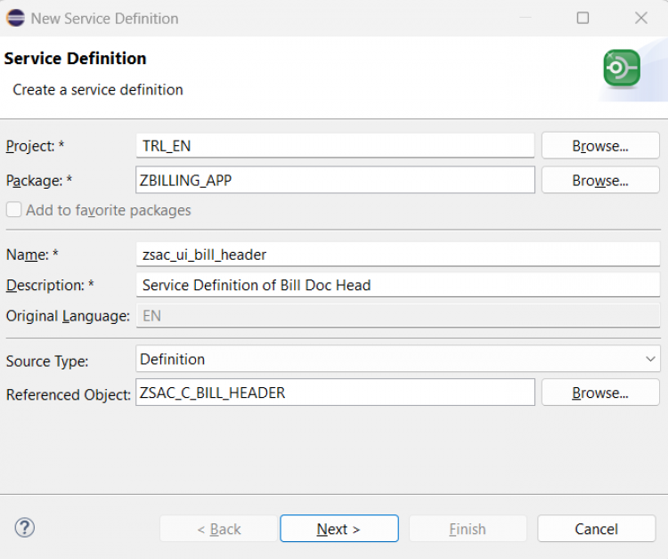 ZSAC_I_Bill_Header) and a meaningful description. Click Next.