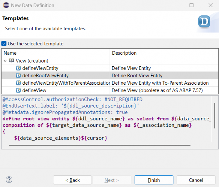 Choose the template Define Root View Entity and click Finish.