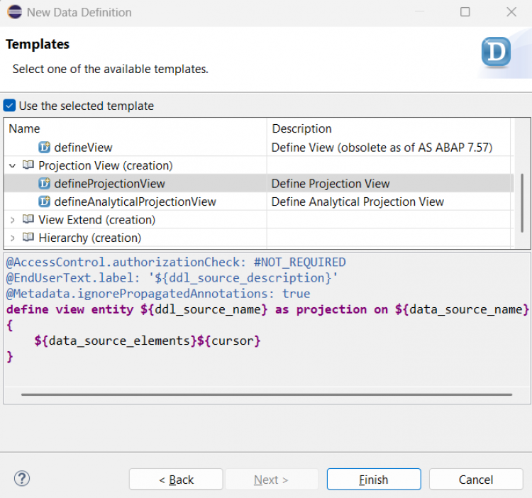 Since we are creating a projection on top of a Root View Entity, the template does not automatically add therootkeyword. You will encounter some errors initially, but we will fix them in the next step.