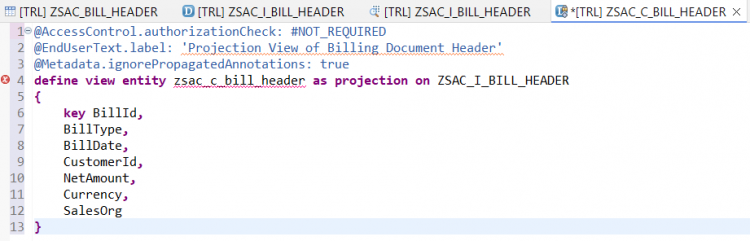 Replace the generated code with the following:@AccessControl.authorizationCheck: #NOT_REQUIRED @EndUserText.label: 'Projection View of Billing Doc Header' @Metadata.allowExtensions: true define root view entity zsac_c_bill_header provider contract transactional_query as projection on ZSAC_I_BILL_HEADER { key BillId, BillType, BillDate, CustomerId, @Semantics.amount.currencyCode: 'Currency' NetAmount, Currency, SalesOrg, CreatedBy, CreateDat, LastChangedBy, LastChangeDat, LocalLastChangeDat }Activate the projection view.