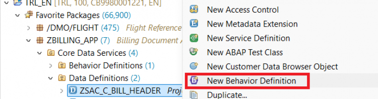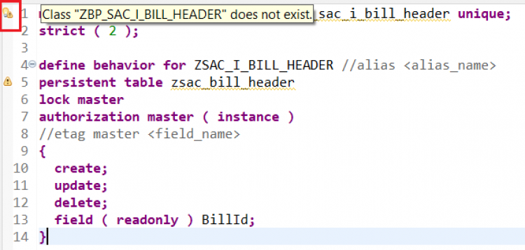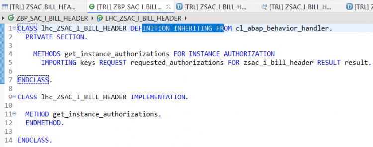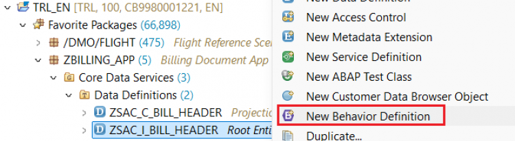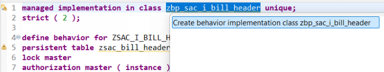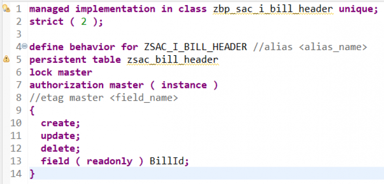 managed implementation in class zbp_sac_i_bill_header unique; strict ( 2 ); define behavior for ZSAC_I_BILL_HEADER persistent table zsac_bill_header lock master authorization master ( instance ) { create; update; delete; field ( readonly:update, mandatory : create ) BillId; mapping for zsac_bill_header { BillId = bill_id; BillType = bill_type; BillDate = bill_date; CustomerId = customer_id; NetAmount = net_amount; Currency = currency; SalesOrg = sales_org; CreatedBy = createdby; CreateDat = createdat; LastChangedBy = lastchangedby; LastChangeDat = lastchangedat; LocalLastChangeDat = locallastchangedat; } }Activate the behavior definition.