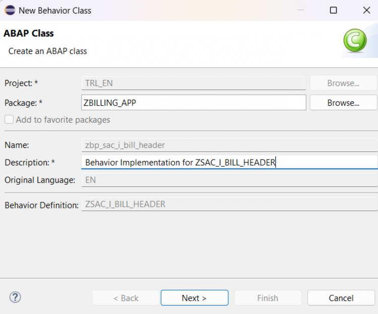 ZSAC_C_BillHeader) and a meaningful description. Click Next.