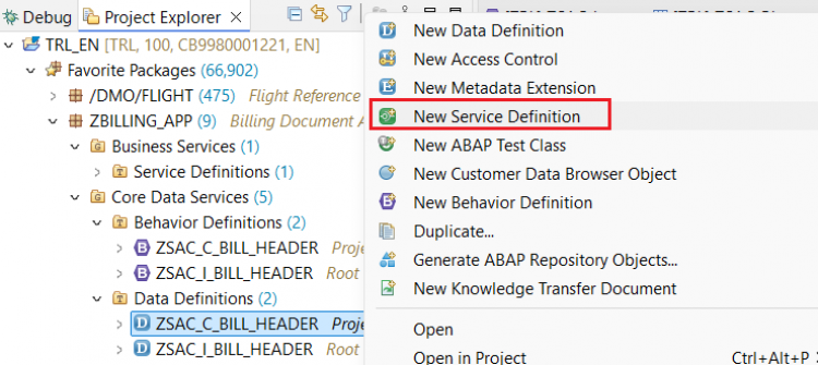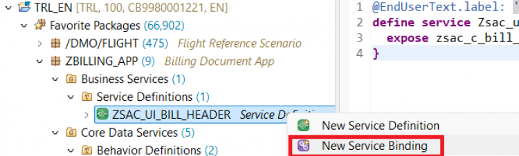 Replace the generated code with the following:@EndUserText.label: 'Service Definition of Bill Doc Head' define service Zsac_ui_bill_header { expose zsac_c_bill_header as BillingDocumentHeader; }Activate the service definition.