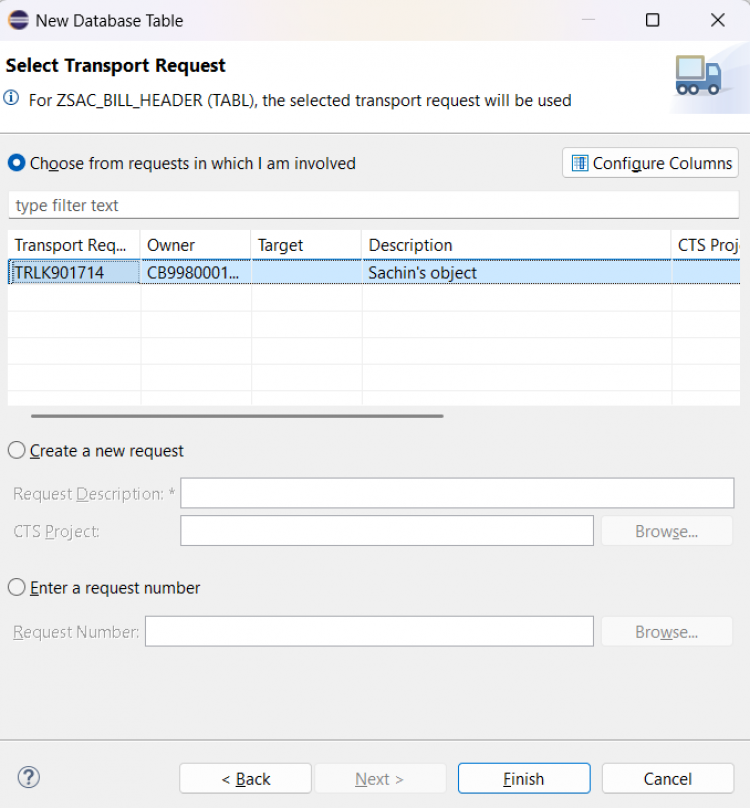Choose a transport request and click Finish