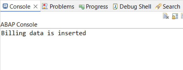 CLASS zsac_cl_bill_data DEFINITION PUBLIC FINAL CREATE PUBLIC . PUBLIC SECTION. INTERFACES if_oo_adt_classrun . PROTECTED SECTION. PRIVATE SECTION. ENDCLASS. CLASS zsac_cl_bill_data IMPLEMENTATION. METHOD if_oo_adt_classrun~main. DATA lt_bill_header TYPE STANDARD TABLE OF zsac_bill_header. DELETE FROM zsac_bill_header. lt_bill_header = VALUE #( ( client = sy-mandt bill_id = '1000000001' bill_type = 'F2' bill_date = '20250401' customer_id = '100001' net_amount = '1500.00' currency = 'INR' sales_org = '1000' ) ( client = sy-mandt bill_id = '1000000002' bill_type = 'F2' bill_date = '20250402' customer_id = '100002' net_amount = '2500.00' currency = 'INR' sales_org = '1000' ) ( client = sy-mandt bill_id = '1000000003' bill_type = 'F8' bill_date = '20250403' customer_id = '100003' net_amount = '1800.00' currency = 'USD' sales_org = '2000' ) ( client = sy-mandt bill_id = '1000000004' bill_type = 'F2' bill_date = '20250404' customer_id = '100004' net_amount = '3000.00' currency = 'EUR' sales_org = '3000' ) ( client = sy-mandt bill_id = '1000000005' bill_type = 'F2' bill_date = '20250405' customer_id = '100005' net_amount = '2200.00' currency = 'INR' sales_org = '1000' ) ). INSERT zsac_bill_header FROM TABLE @lt_bill_header. out->write( 'Billing data is inserted' ). ENDMETHOD. ENDCLASS. - Run the class using the green "Execute" button.